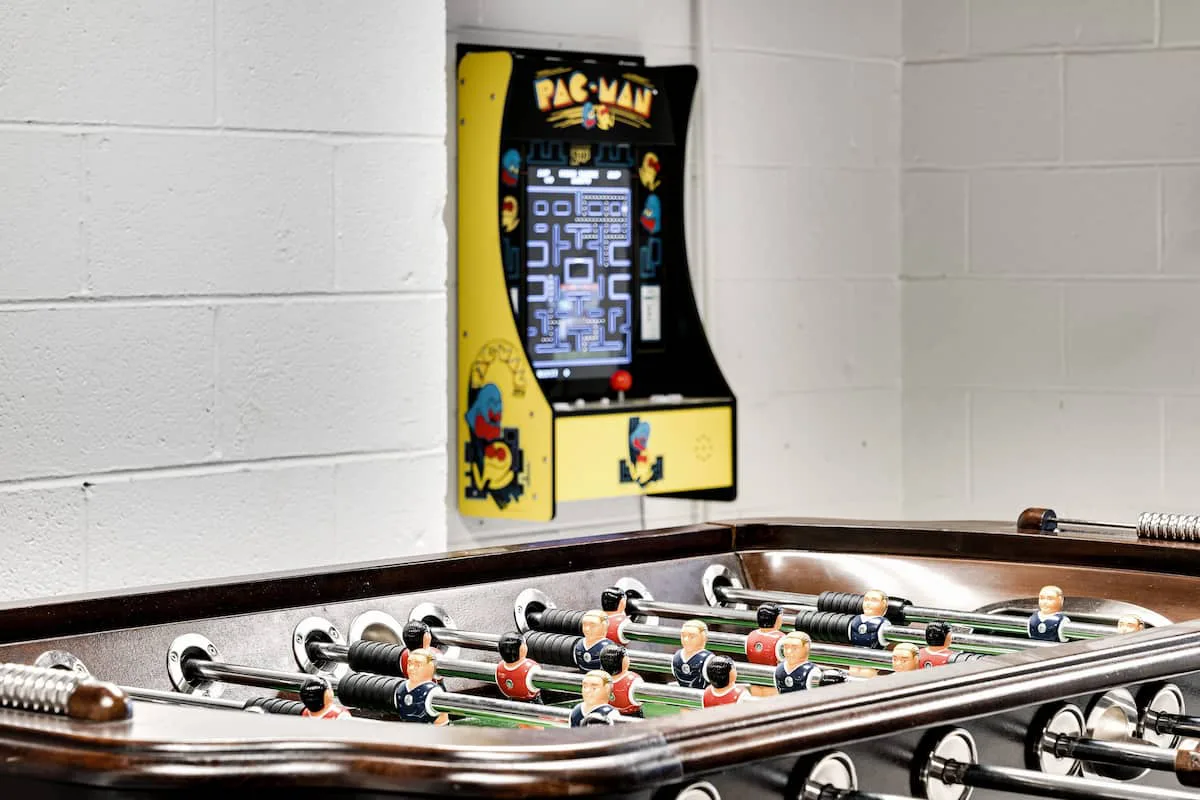 ☞ 3 living rooms + game lounge with arcade, foosball, hockey & 75″ TV
