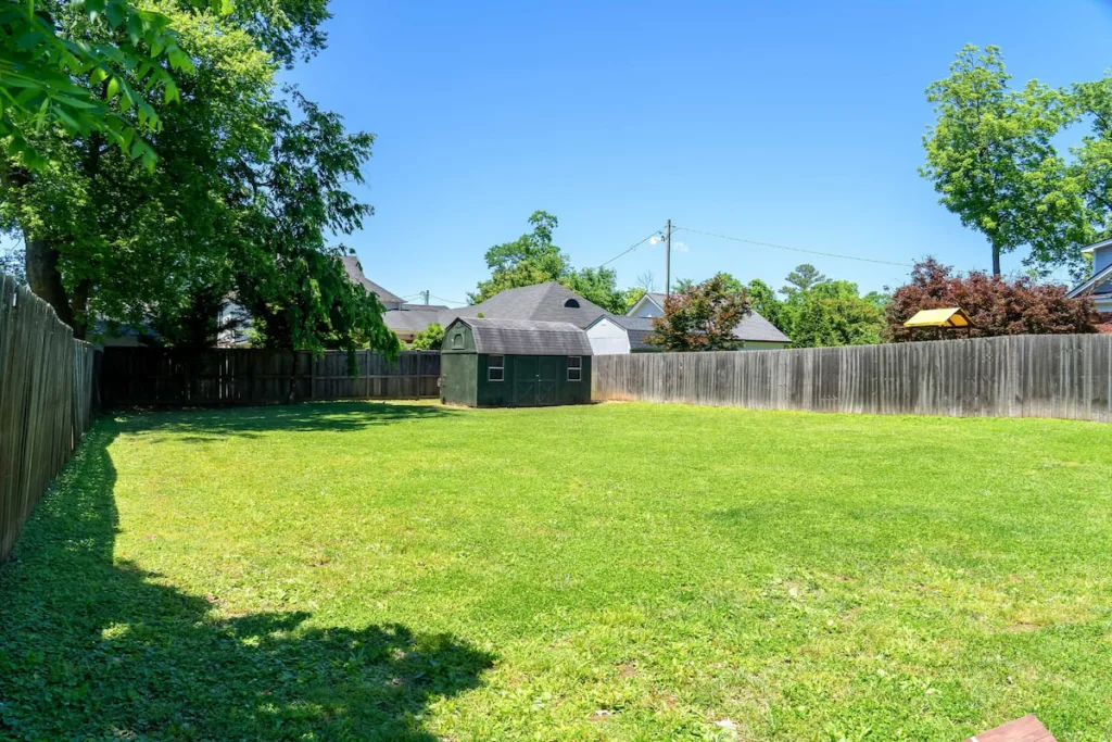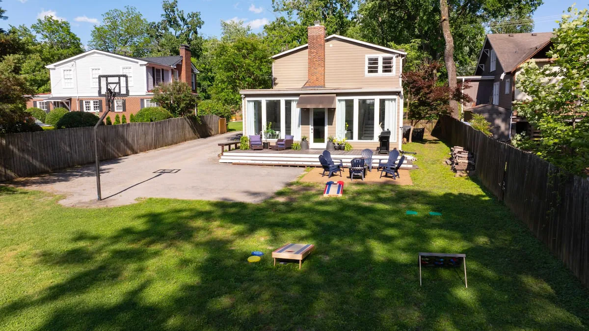 The fully fenced backyard is perfect for relaxing or entertaining, with a BBQ grill, fire pit, outdoor seating, and lawn games like cornhole. Ideal for families with kids or dogs.