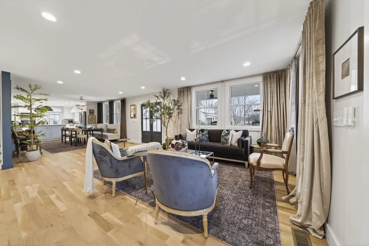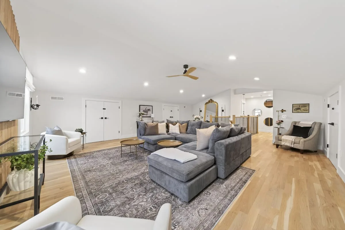 The open-concept main level features a spacious living room with comfortable seating, a large smart TV, and plenty of natural light. The layout flows seamlessly into the dining area and kitchen, making it perfect for gathering with family and friends.